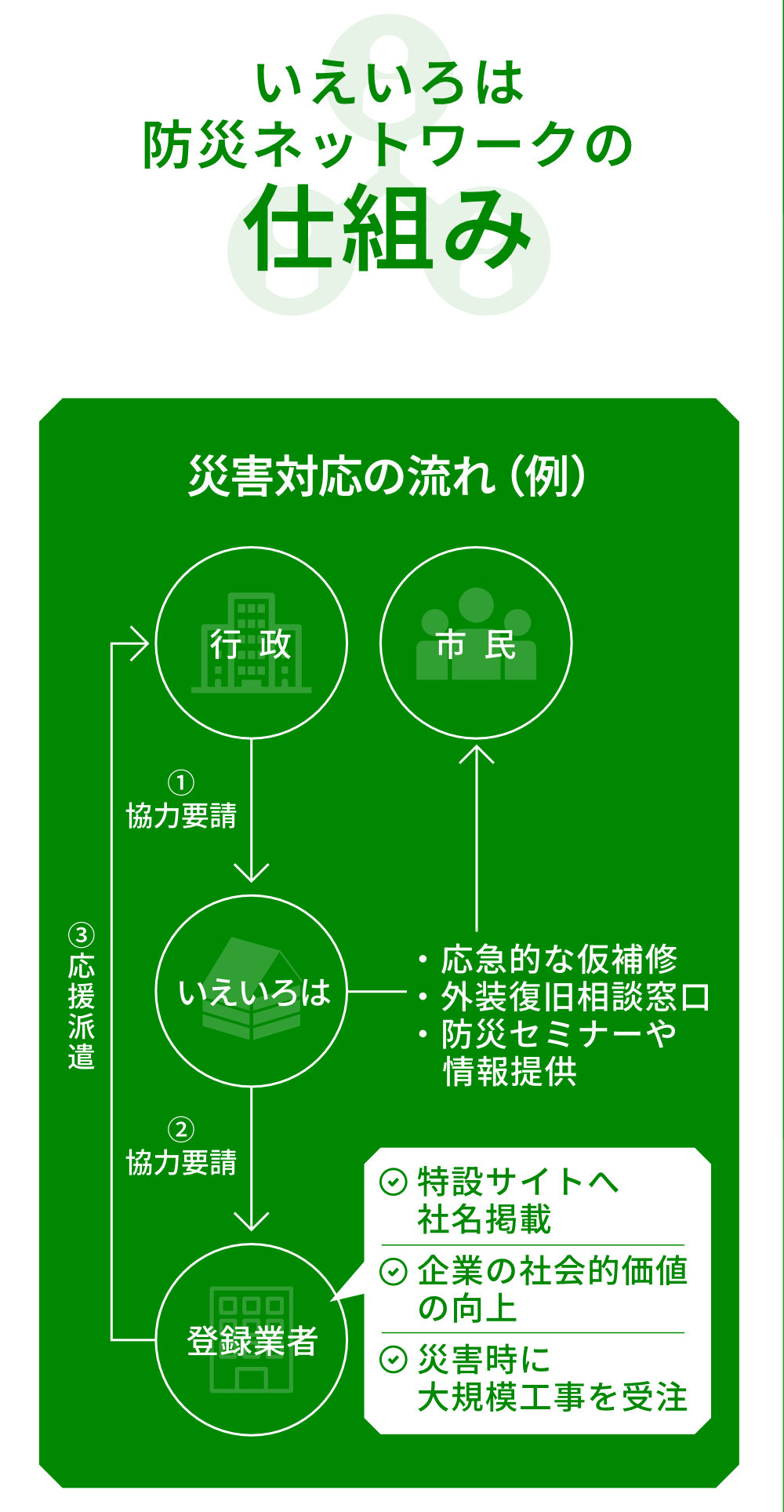 災害発生時に地方自治体と連携しながら復旧活動を行う屋根・外壁・塗装・足場事業者などの会員を募集しております。(災害発生時にお仕事をご依頼させていただく可能性があります)