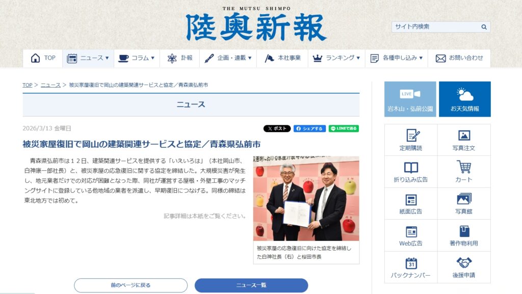 いえいろは株式会社が青森県弘前市と締結した、災害時における家屋外装等の応急復旧支援に関する協定について、陸奥新報(2026年3月13日付)にて紹介されました。